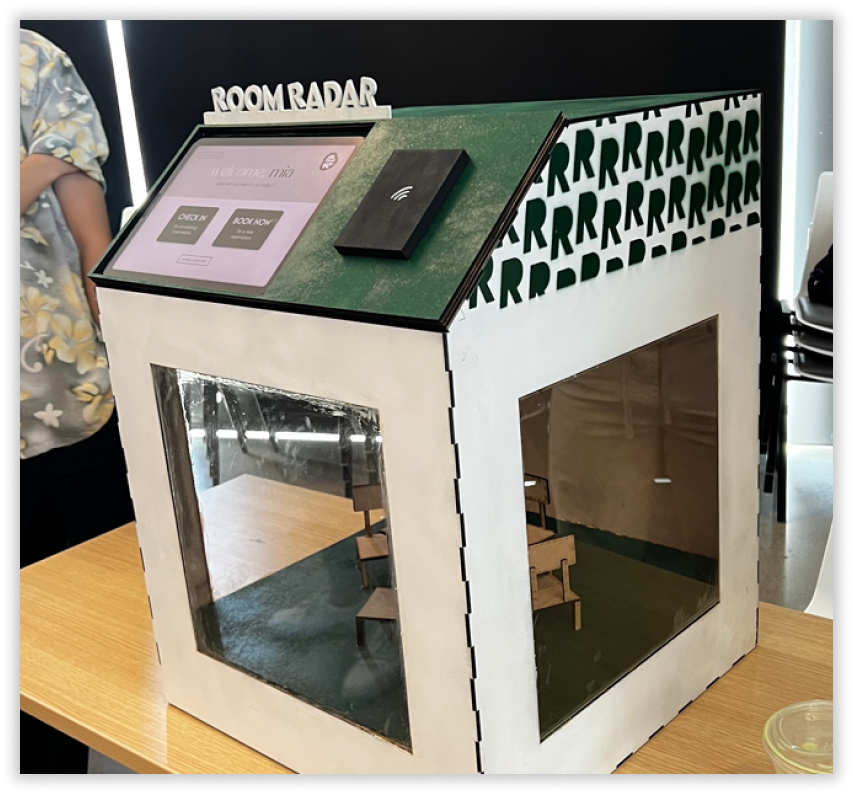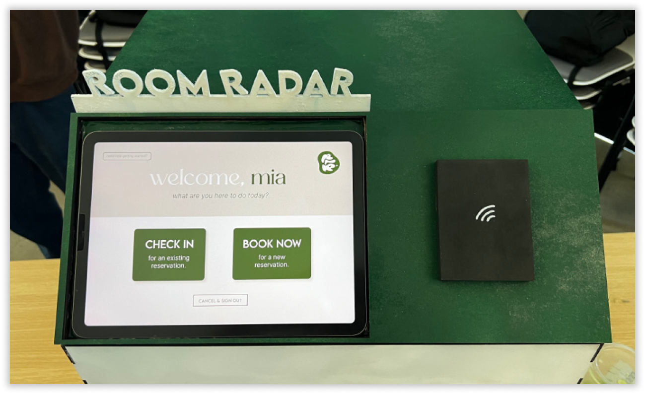 A cutout sign with our kiosk name, “Room Radar“. The sign would be painted a contrasting color and placed at the top of the kiosk so that users could see it from a distance.