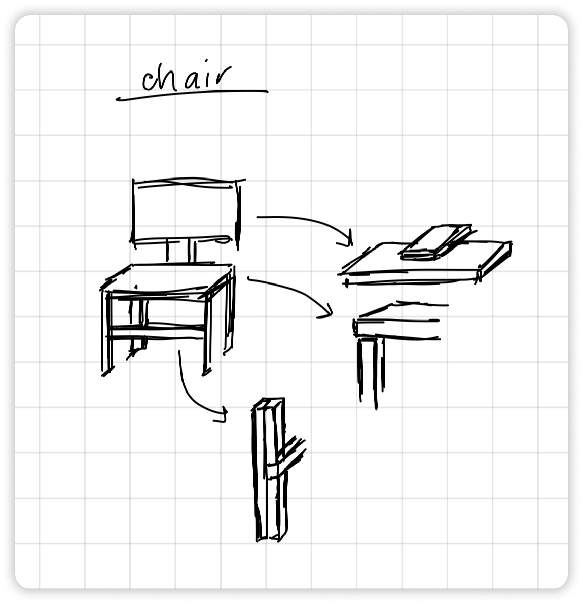 I then made some more detailed sketches outlining how certain parts of the kiosk should be put together. For instance, the chair would be constructed by cutting out the individual wood pieces before gluing them together as shown.