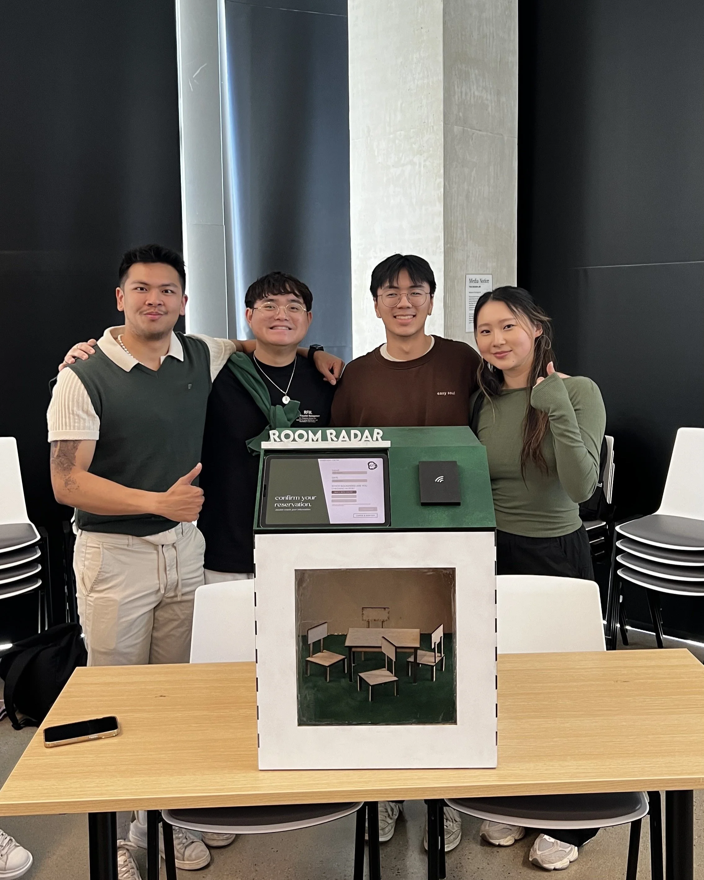 (Above): Me and my team behind our completed physical kiosk with the integrated digital screen.